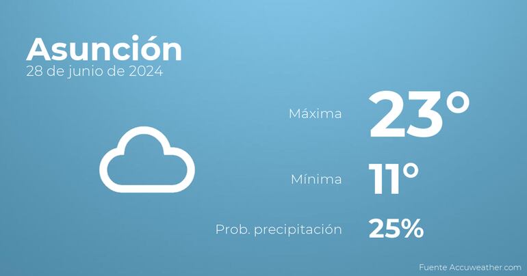 Hoy por la mañana en Asunción estará muy nublado con poca probabilidad de lluvias. Según pasen las horas el cielo estará cubierto con probabilidad de lloviznas generalizadas. Por lo que respecta a las temperaturas, estas variarán entre una máxima de 23 y una mínima de 11 grados. Viento del sureste de carácter flojo con valores de hasta 39 Km/h.