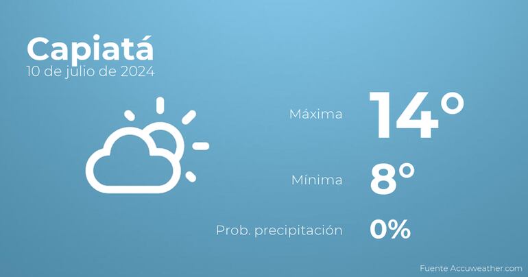 En las primeras horas del día en Capiatá se esperan pocas nubes con poca probabilidad de precipitaciones....