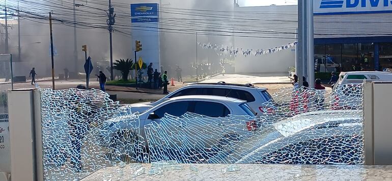 Disparos de balines de goma, mucho humo negro a causa de quema de neumáticos, lanzamiento de cascotes y balitas es la constante en este violento enfrentamiento sobre la ruta PY07, en inmediaciones al Km 4 de Ciudad del Este. El contingente policial está siendo prácticamente obligado por los manifestantes a retroceder.
