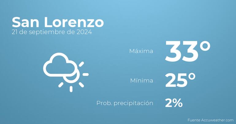 Durante la mañana en San Lorenzo se prevén más nubes que claros. A medida que avance el día se esperan nubes y claros. En cuanto a las temperaturas, estarán entre los 33 grados de máxima y 25 de mínima. Además, se esperan vientos sin apenas intensidad con rachas de hasta 32 Km/h.