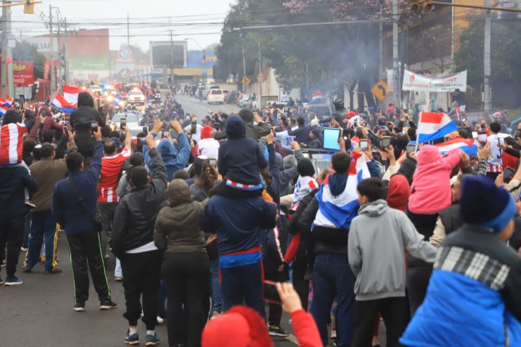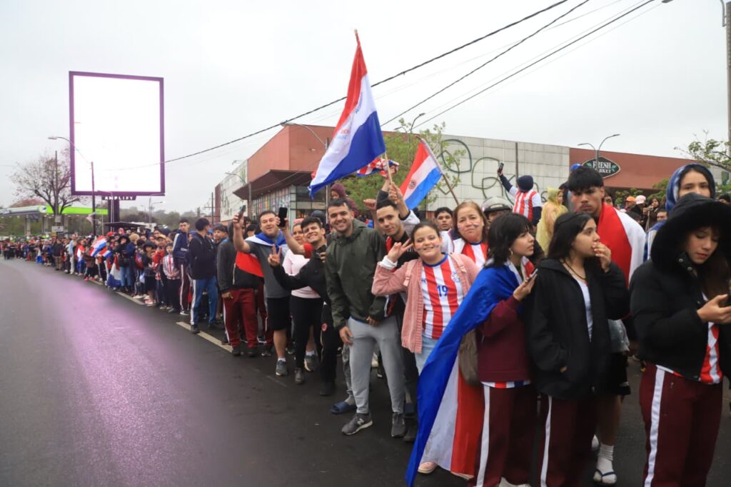 El bus que transporta a los peloteros de la Selección Paraguaya, es esperado y acompañado, por miles de hinchas a lo largo de la ruta desde que salió de Ypané. ¡Pirĩ causa ver tantas banderas, y remeras!