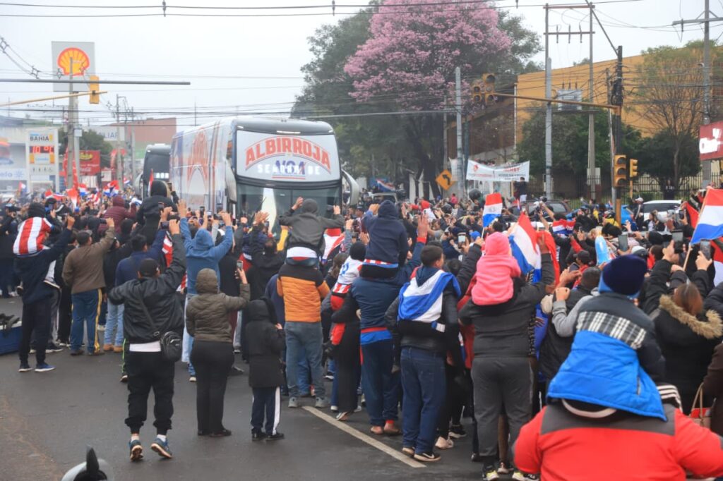 El bus que transporta a los peloteros de la Selección Paraguaya, es esperado y acompañado, por miles de hinchas a lo largo de la ruta desde que salió de Ypané. ¡Pirĩ causa ver tantas banderas, y remeras!