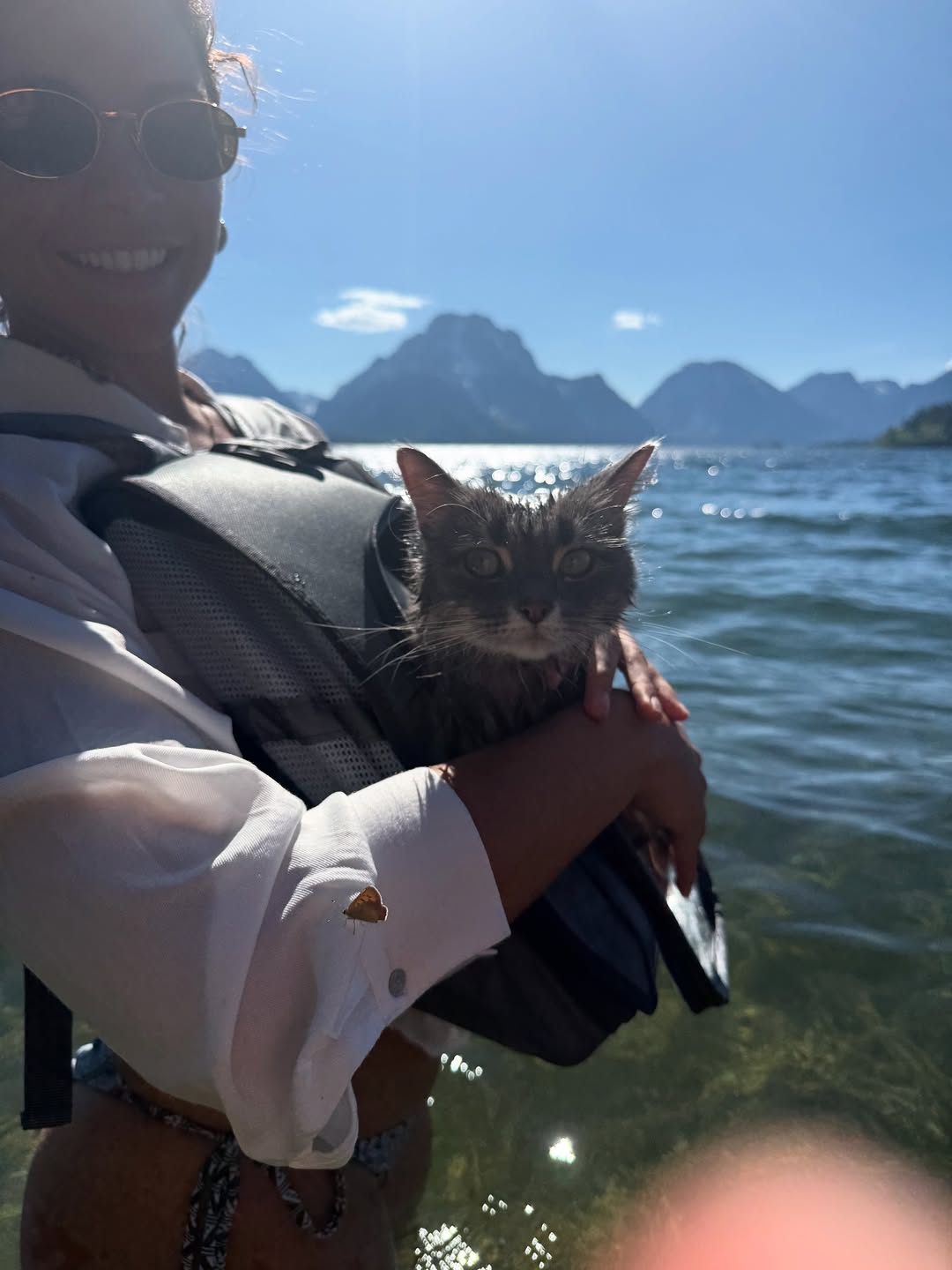 Se fueron a Jackson Lake, en Alabama, a disfrutar del agua y de la naturaleza. Su gatita, bien protegida en su bolsito, se ve que disfrutaba de su paseíto y hasta de entrar el agua.