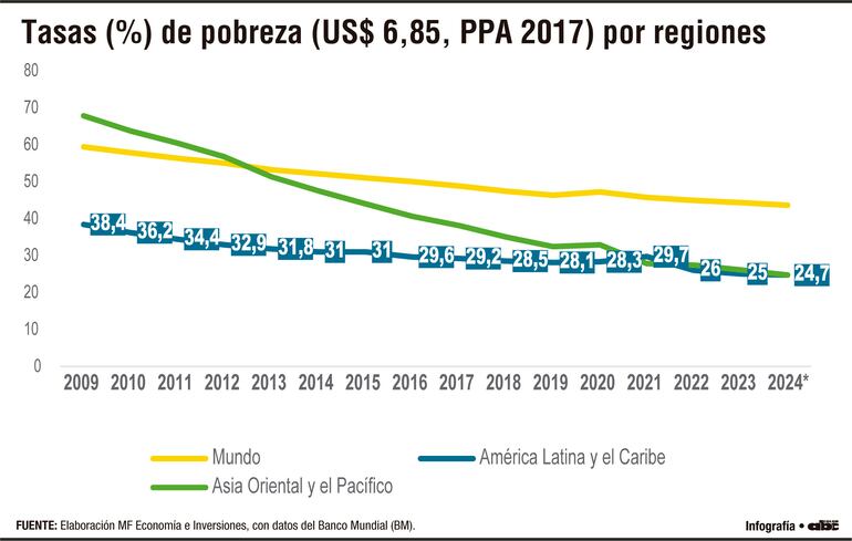 Desde 2016 la reducción de la pobreza ha avanzado a un ritmo lento, en línea con el bajo crecimiento económico registrado en Latinoamérica. Durante este periodo la expansión del Producto Interno Bruto (PIB) ha sido considerablemente menor en comparación con otras economías de ingresos medios. En contraste, en 2009 la tasa de pobreza en Asia Oriental y el Pacífico superaba en 30 puntos porcentuales a la de América Latina y el Caribe, pero para 2023 ambas regiones alcanzaron niveles…