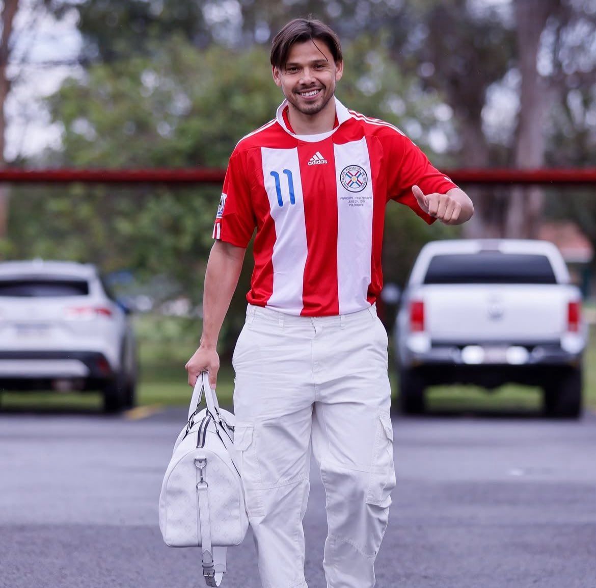 El delantero Angel Romero se sumó esta tarde al plantel de la albirró en Ypané y sorprendió el look con el que llegó. Un pantalón casual en tono blanco y una camisera albirroja del 2010 que usaba Jonathan Santana. Así llegó el jugador del Corinthians.