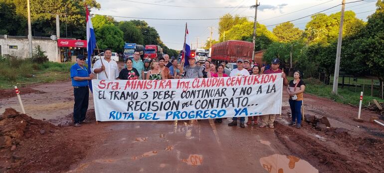 A pesar del aguacero que se registró en la zona, los vecinos de la comunidad de Loma Pero, compañía de San Juan Bautista, Misiones, continuaron con su movilización esta tard. Los mismos exigieron la reanudación de los trabajos del tramo tres de la Ruta del Progreso.