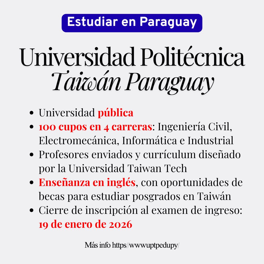 Hay 50 cupos para estudiantes paraguayos para estudiar en Taiwán. Para grados de maestría, doctorado en ciencias, tecnología, matemáticas, ingeniería y salud. Y hay 100 cupos para la Universidad Politécnica Taiwán Paraguay.