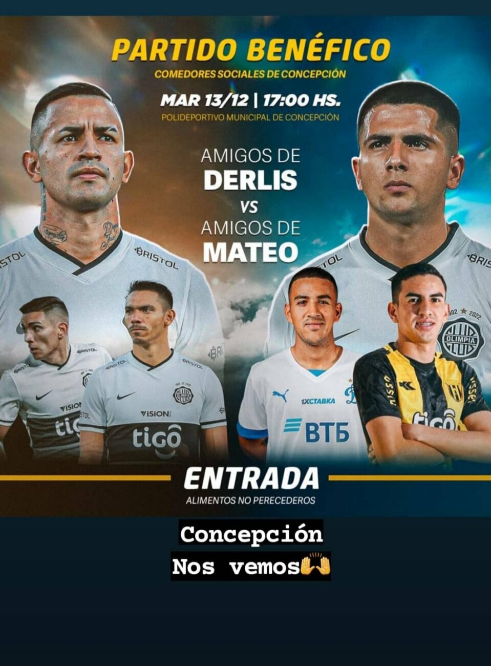 La entrada será alimentos no perecederos, destinado a los comedores sociales de la zona de Concepción. Además de González y Gamarra, se presentarán más figuras de nuestro fútbol para el partido amistoso.